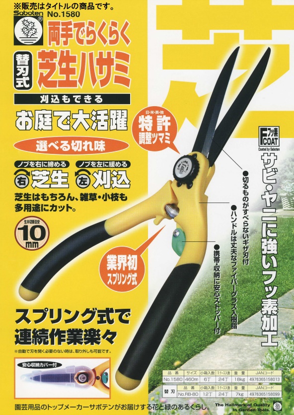サボテン 芝生鋏 両手タイプNo.1580ノブを回してシャープとソフトに選べる切れ味■特長・フッ素コート ---刃物用に開発したフッ素コートはサビ・ヤニに強く、軽い切れ味を持続します。・選べる切れ味調整ツマミ(日・米・英・独 特許) ---ノブを右に締めれば芝生、ノブを左に緩めれば刈込にご利用いただけます。・切るものがすべらないギザ刃付・ハンドルは丈夫なファイバーグラス入樹脂・携帯・収納に安心ストッパー付■仕様・全長460mm ・重量18kg