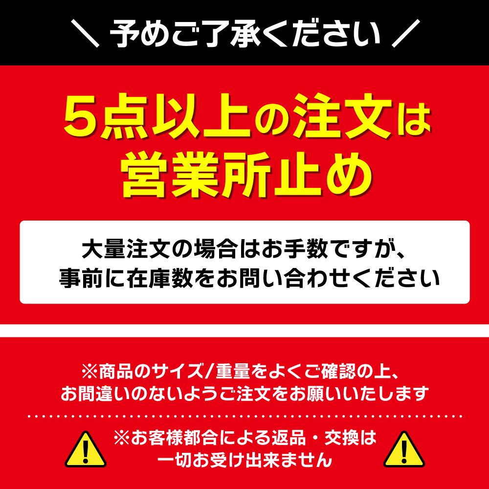 商品詳細をよく確認した上でご注文ください。 サイズ違い・イメージ違いなどによる商品の返品・交換は一切できかねますので予めご了承くださいませ。 商品到着後、7 日以内に状態・動作の確認をお願いします。 ■商品破損 外箱の損傷・梱包の破れ等がある場合は 運送業者 にご連絡ください。 ( 運送業者より代品依頼があり次第、迅速に交換品を手配します。) ■初期不良・不足品 不良の状態が目視で確認可能な場合は 写真 をいただけますと幸いです。 |
