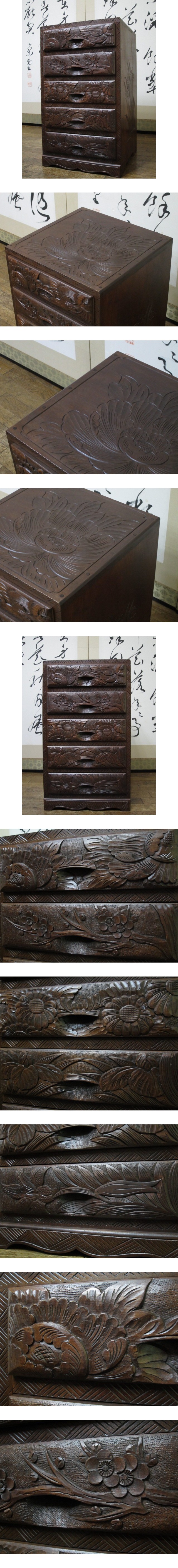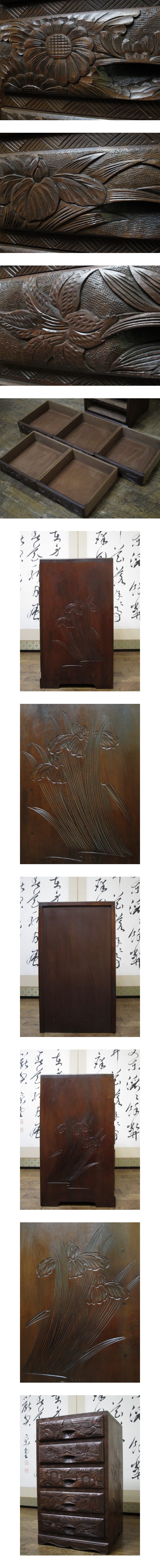 逸品 伝統工芸 日光彫り【牡丹・梅・菖蒲】彫刻 上手造り 5杯抽斗 民芸 箪笥/整理タンス/チェスト(検)軽井沢彫り 收藏