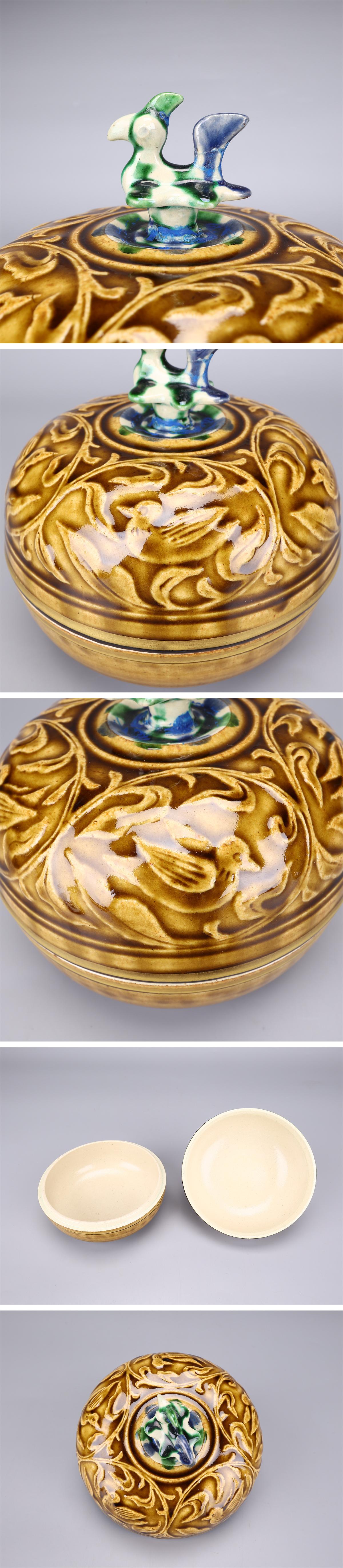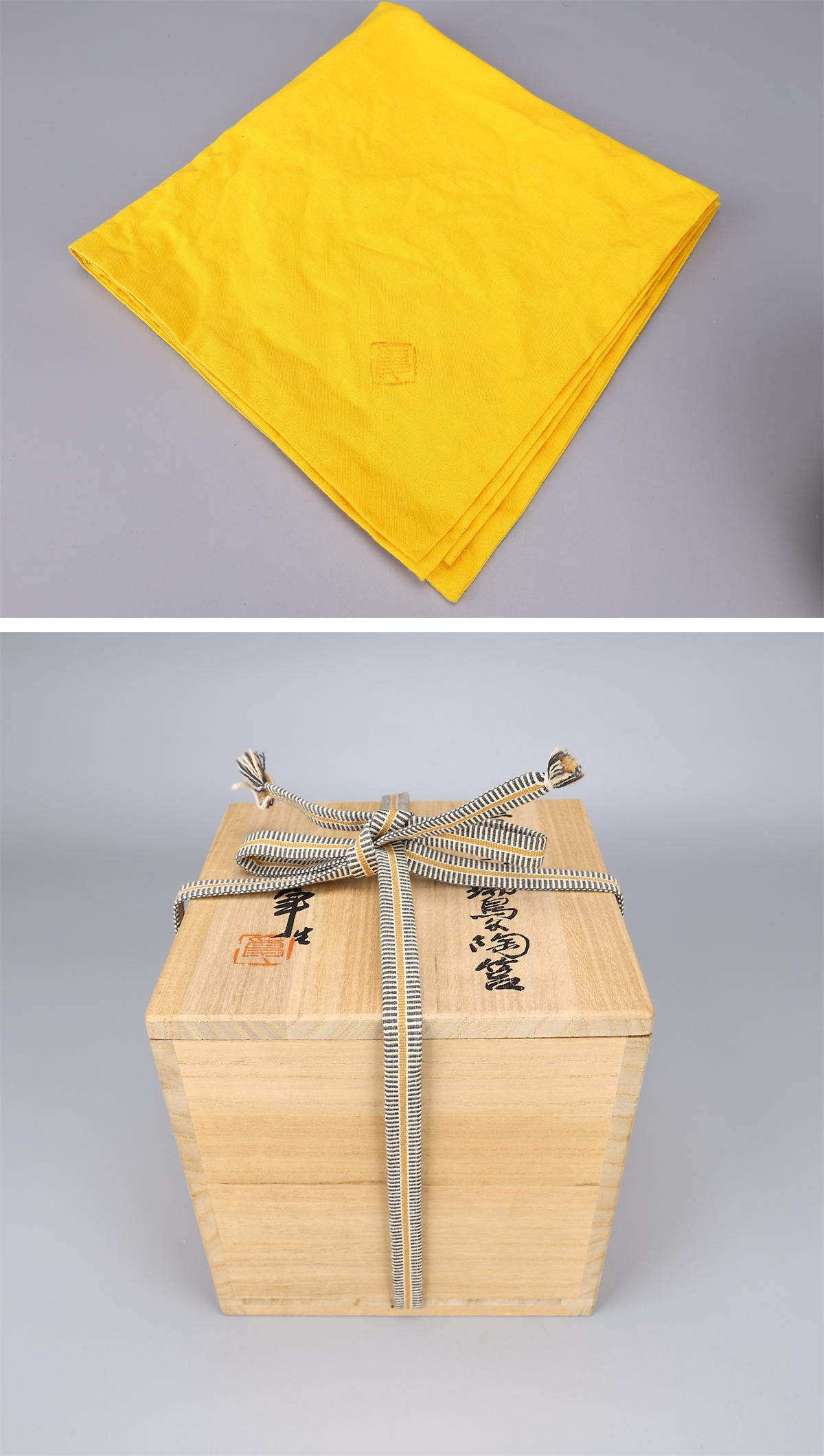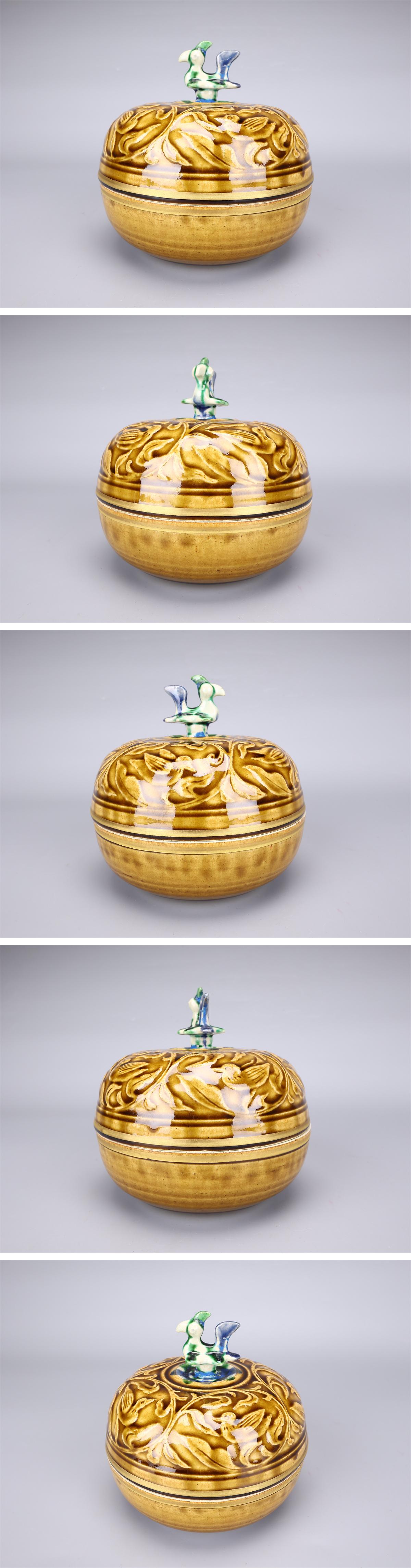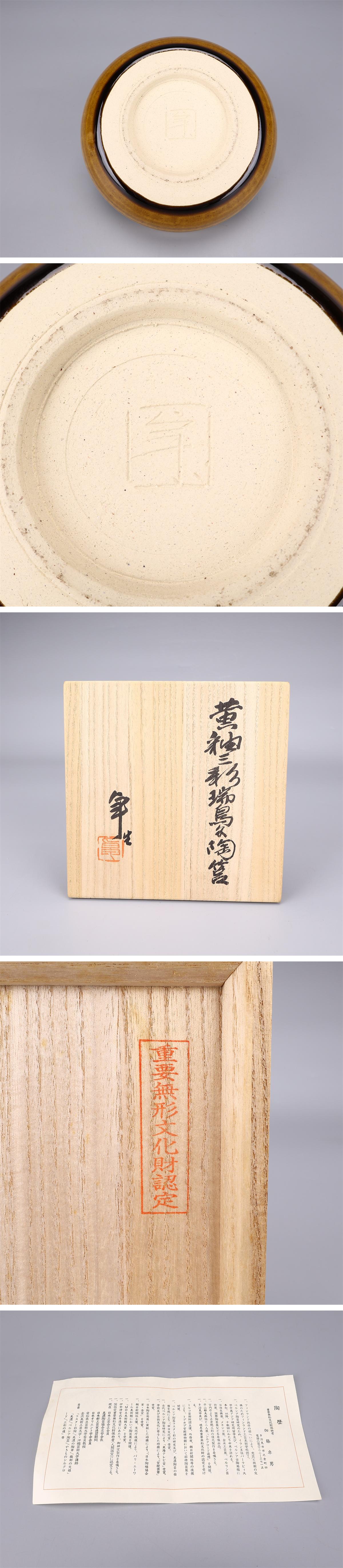 【吉】CM041 人間国宝【加藤卓男】 黄釉三彩瑞鳥文 陶筥/共箱付 摘のなおしあり 本物保証品S! 收藏
