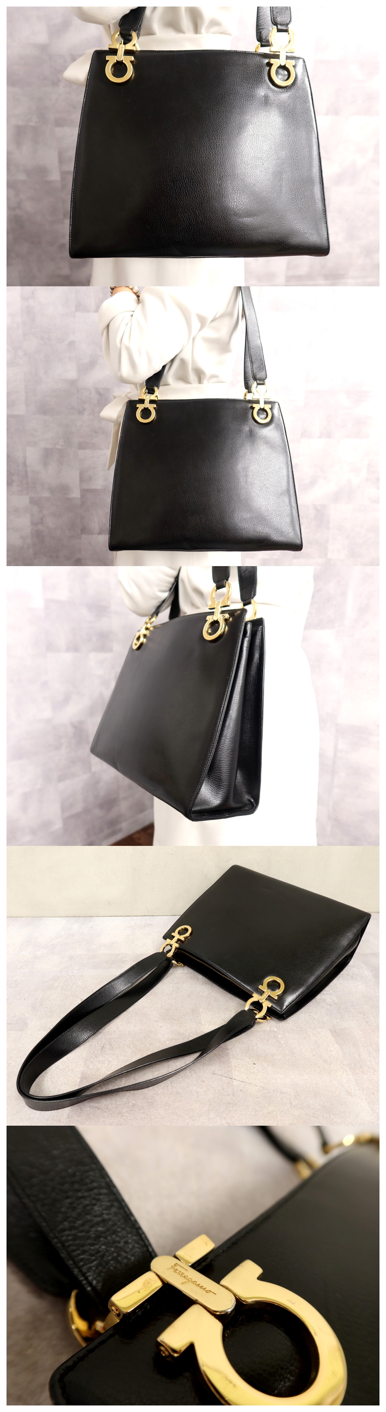 ●超美品●Salvatore Ferragamo フェラガモ●ダブルガンチーニ●カーフ レザー 本革●ショルダー バッグ●黒●ゴールド金具●B5●Js64493 收藏