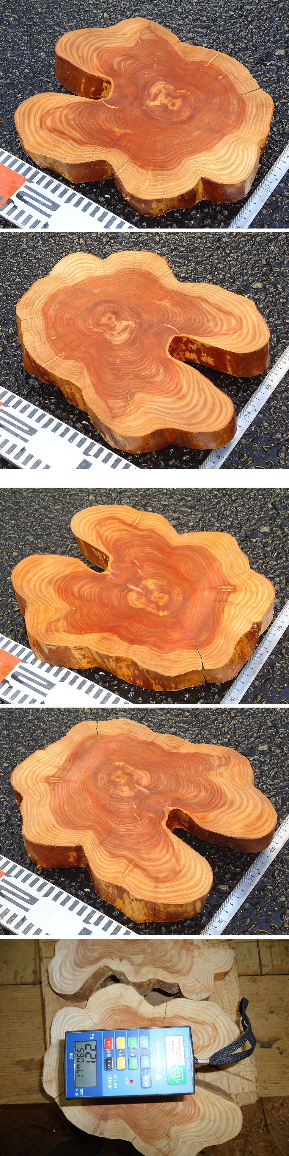 ・加工内容(輪切材で手間のかかる両面電気カンナかけ、及び時間のかかる耳の皮ほぼ取済)のわりに、お求めになり易い価格にしておりますので写真と、状態〔 状 態 ★★★☆☆評価〕でご判断ください。