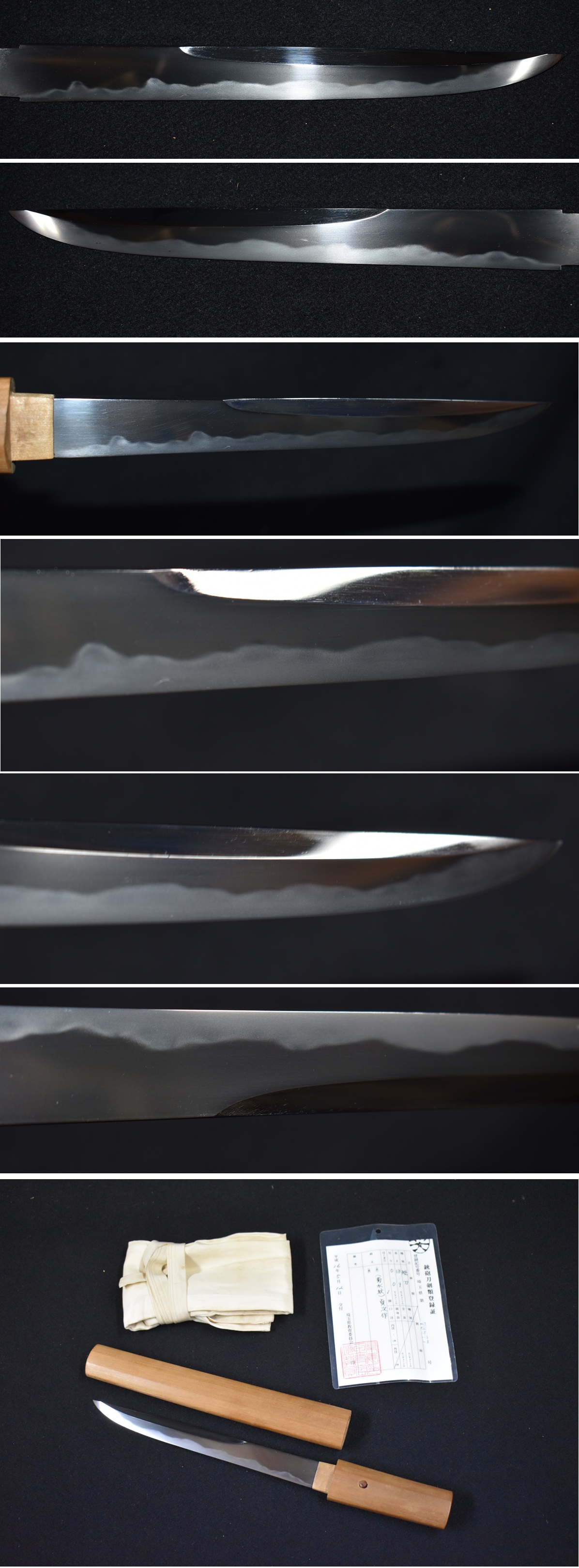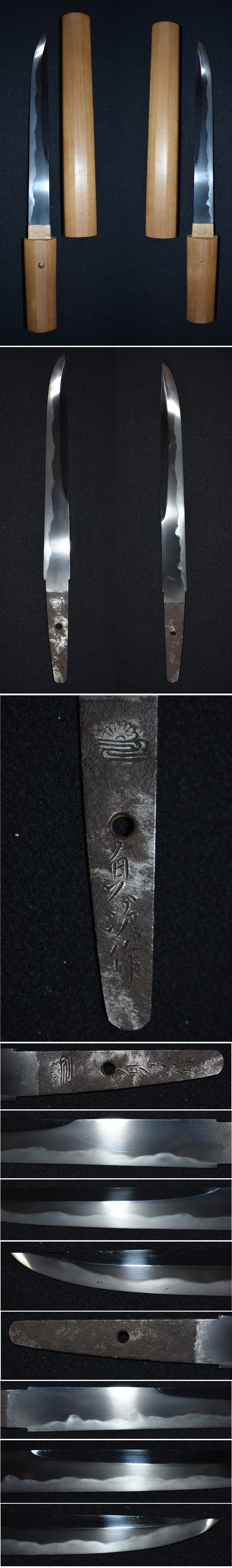 ご覧頂きありがとうございます。今回出品する品は写真の短刀です。 銃砲刀剣類登録証番号 埼玉県 第73877号 種別 短刀 長さ 18.9センチ 反り 0.0センチ 目くぎ穴 1個 元幅約2.2センチ 元重約0.7センチ 銘文 (菊水紋)貞次作 大変珍しい菊水刀の短刀です。人間国宝(重要無形文化財保持者)で有名な高橋貞次刀匠 の短刀になります。 元々は、海軍短剣の大型短剣拵えに入っていた刀身です。菊水刀は大日本帝国海軍の御刀で、 その中でも上官用に作られた御刀です。その刀には「菊水紋」を入れることが許され、刀身の 茎(なかご)の菊水紋が彫ってあります。 海軍短剣でも大型短剣は、大日本帝国海軍の将官が持っていた短剣で、数は少なく貴重な短刀 になります。 高橋貞次刀匠は、刀匠で初めて、人間国宝に指定された名工です。初期の作品は軍刀を作ってい いましたが、現存数は少なく、貴重な短刀になります。 状態は、初茎で鵜の首造りの乱れ刃紋で、茎には菊水紋と銘があります。 研ぎも綺麗で、錆や刃こぼれやハギレはありません。短剣拵えは付属しませんが、貴重な刀身 であります。是非、よろしくお願いいたします。 「菊水刀」(きくすいとう)とは、旧日本海軍の士官用軍刀として作刀された本鍛錬刀のこと。 鎌倉時代末期から室町時代にかけて活躍した武将「楠木正成」(くすのきまさしげ)の家紋「菊 水紋」が施されていることにちなみ、名付けられました。1940年(昭和15年)から制作された軍 刀です。 1933年(昭和8年)、刀剣の復活と将校用軍刀の需要に応えるために、靖国神社で「日本刀鍛錬会 」がつくられ、「日本刀鍛錬所」が設置されました。その流れを汲み、1940年(昭和15年)、兵 庫県神戸市の「湊川神社」(みなとがわじんじゃ)にも鍛刀場が設立。 靖国神社日本刀鍛錬会(1933~1945年)で修行を積んだ、「村上道政」刀工(銘:正忠)と「森 脇要」刀工(銘:正孝)が、湊川神社の御用刀工に抜擢されます。これにより、靖国神社では陸 軍用軍刀が、湊川神社では海軍用軍刀が制作されることになりました。 そんな海軍用軍刀の名前、菊水刀は、湊川神社の祭神「楠木正成」が、「後醍醐天皇」から下賜 されたとされる家紋「菊水紋」を、「茎」(なかご)と「」(はばき)に彫ったことにちなん で付けられています。 現存する物は非常に少なく、とても貴重です。その理由は、1939年(昭和14年)~1945年(昭和 20年)にかけて行なわれた「第2次世界大戦」において、旧日本海軍が、アメリカに大敗を喫し、 軍艦と共に多くの軍刀も海の藻屑と消えたためです。 高橋貞次 (本名:高橋金市)人間国宝(重要無形文化財保持者) 「高橋金市」(たかはしきんいち)は、1902年(明治35年)に伊予(現在の愛媛県)で誕生しま した。 兄の影響で刀匠の道を志した金市は、1917年(大正6年)15歳で初代「月山貞一」(がっさんさだ かず)、「月山貞勝」(がっさんさだかつ)親子に入門。作刀や刀身彫刻の技術を学びました。 金市は1936年(昭和11年)に鍛錬場を開設し「貞次」(さだつぐ)を名乗り始めます。 その後、第1回新刀展示会で総理大臣賞を受賞、1944年(昭和19年)熱田神宮大鍛刀場の主任刀匠 に任命されるなど、刀匠として全盛期を迎えます。 しかし、1945年(昭和20年)に第二次世界大戦が終わると、鍛刀禁止令が施行。多くの刀匠が包丁 鍛冶などに転向する中、貞次は戦火を免れた鍛冶場に住み、家財道具を売って生活難をしのぎました。 それでも生活が苦しかったため、心中も考えましたが、自分が死んでしまうと日本刀の伝統技術が 廃れてしまうと思いとどまり、一層日本刀の研究に邁進しました。やがて作刀が許可制になり、19 51年(昭和26年)の伊勢神宮ご遷宮の際には宝刀を鍛刀。1952年(昭和27年)に無形文化財となり 、貞次は再び刀匠界で注目されるようになります。 貞次の作風は、備前伝の「丁子刃文」(ちょうじはもん:日本刀[刀剣]の刃の部分の模様が丁子の 実を連ねた形に見える)を得意としていた作刀です。また、刀身彫刻においても非凡な才能を誇り、 これらを駆使して多くの名刀を残しました。そして1955年(昭和30年)、それまでの功績が認めら れ刀匠としては初の重要無形文化財(人間国宝)に認定されています。 質問は入札前にお願いいたします。わかる範囲でお答えいたします。 発送はゆうパックの着払いです。 ※注意事項※落札しましたら、登録のある教育委員会に所有者変更届(名義変更)を出してください。 よろしくお願いいたします。 |