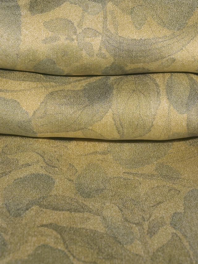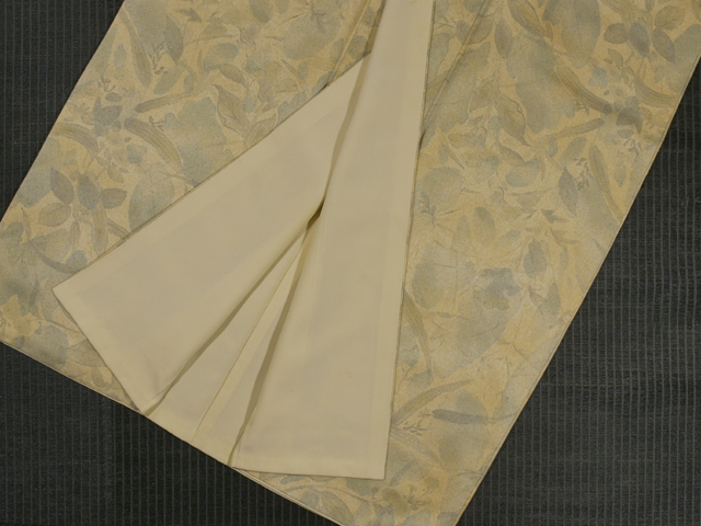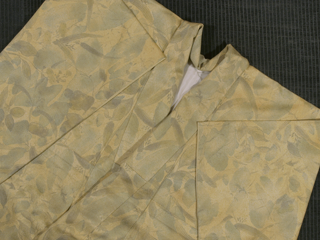 ごく淡い桑染(くわぞめ)色の地に、草花の文様が染められている、紋綸子縮緬の訪問着です。袷仕立てです。 色紙絵のような趣きであらわされた草花にかなげな美しさとおもしろみが感じられます。なめらかでやわらかな上質の綸子地です。 ユーズド品としてはいますが、使用感は感じられません。しみやよごれ、褪色などのダメージも見あたらず、ほぼ新品同様にきれいな状態です。 |