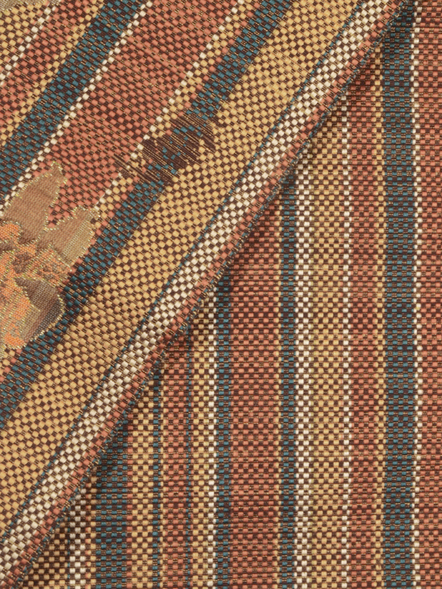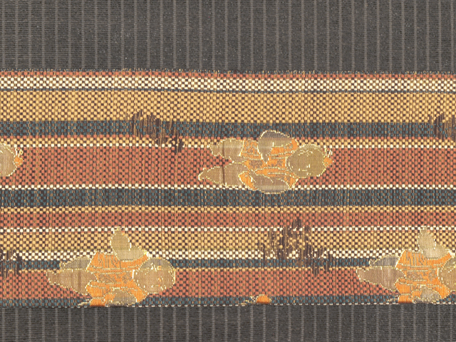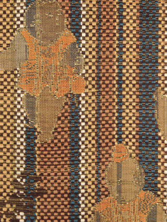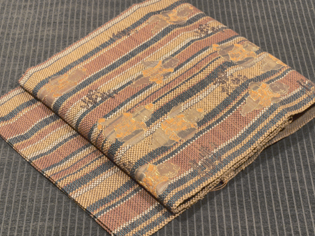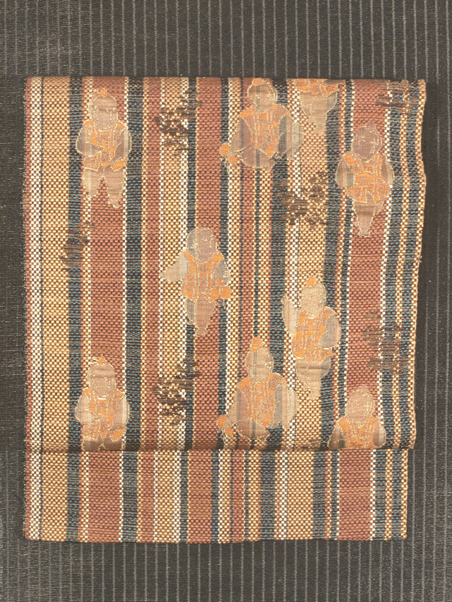 白色、黄唐茶(きがらちゃ)色、駱駝(らくだ)色、天鵞絨(びろうど)色のたて縞の地に、御所人形の文様が織り込まれている、西陣織の八寸名古屋帯です。 コミカルな御所人形が愛らしくも格調のある雰囲気であらわされていて、たて縞とあいまって粋なおもしろさが感じられます。紋博多織のようなハリのある地風です。 ユーズド品で、前の折り跡はありますが、使用感はあまり感じられません。しみやよごれ、褪色などのダメージも見あたらず、たいへんきれいな状態です。 |