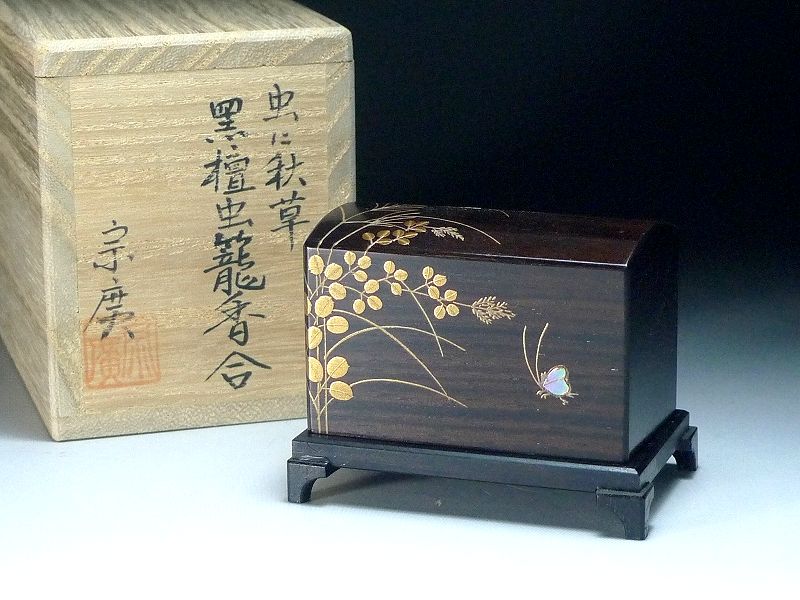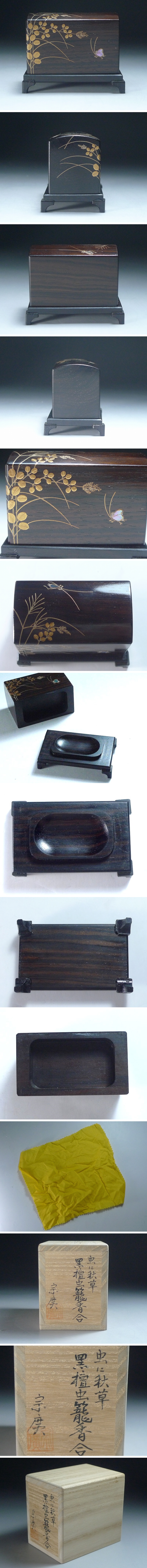 60YT104★茶道具 道場宗廣造 虫に秋草 黒檀虫籠香合 虫籠 摺漆 共箱 共布 香盒 置物 飾り 小物入れ 香道具 收藏