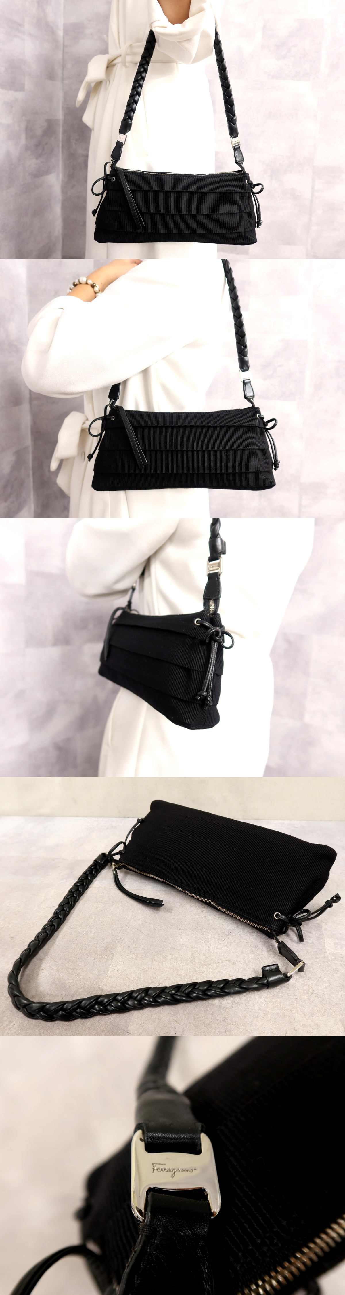 ●超美品●フェラガモ●ティアード●ヴァラ●編み込み●リボン●キャンバス カーフ レザー 本革●ショルダー バッグ●黒●SV金具●Js62585 收藏