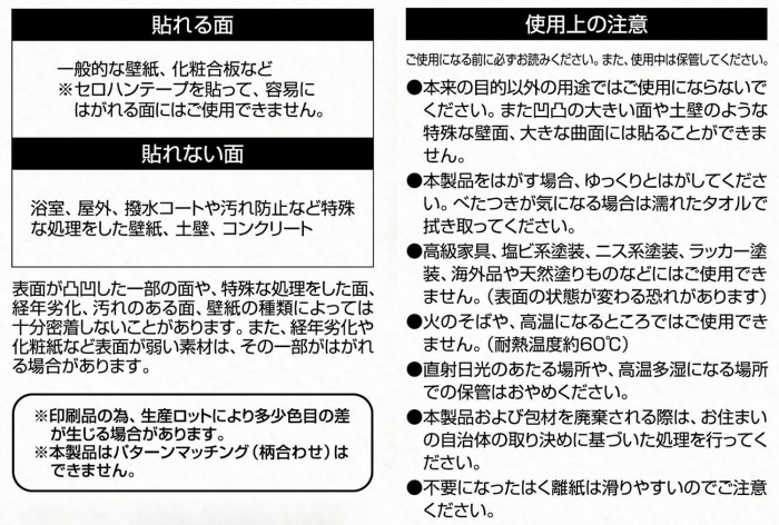 | リアルな質感です。キレイにはがせるので賃貸住宅でも安心します。表面防水で、自由にカットできます。 【使用上の注意】 ご使用になる前に必ずお読みください。また、使用中は保管してください。 ・本来の目的以外の用途ではご使用にならないでください。また凹凸の大きい面や土壁のような特殊な壁面、大きな曲面には貼ることができません。 ・本製品をはがす場合、ゆっくりとはがしてください。べたつきが気になる場合は濡れたタオルで拭き取ってください。 ・高級家具、塩ビ系塗装、ニス系塗装、ラッカー塗装、海外品や天然塗りものなどにはご使用できません。(表面の状態が変わる恐れがあります) ・火のそばや、高温になるところではご使用できません。(耐熱温度約60度) ・直射日光のあたる場所や、高温多湿になる場所での保管はおやめください。 ・本製品および包材を廃棄される際は、お住まいの自治体の取り決めに基づいた処理を行ってください。 ・不要になったはく離紙は滑りやすいのでご注意ください。 |