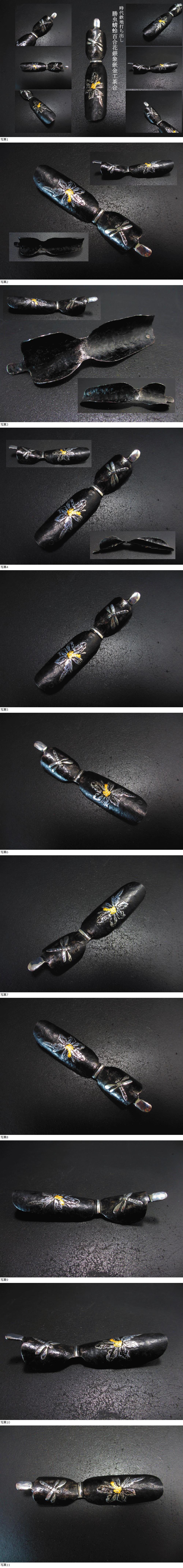 | 時代鉄地打ち出し 勝虫蜻蛉百合花銀象嵌金工茶合 古鍛鉄打ち出し瓢箪形金工茶合 茶則 茶量 仙媒 煎茶道具 |