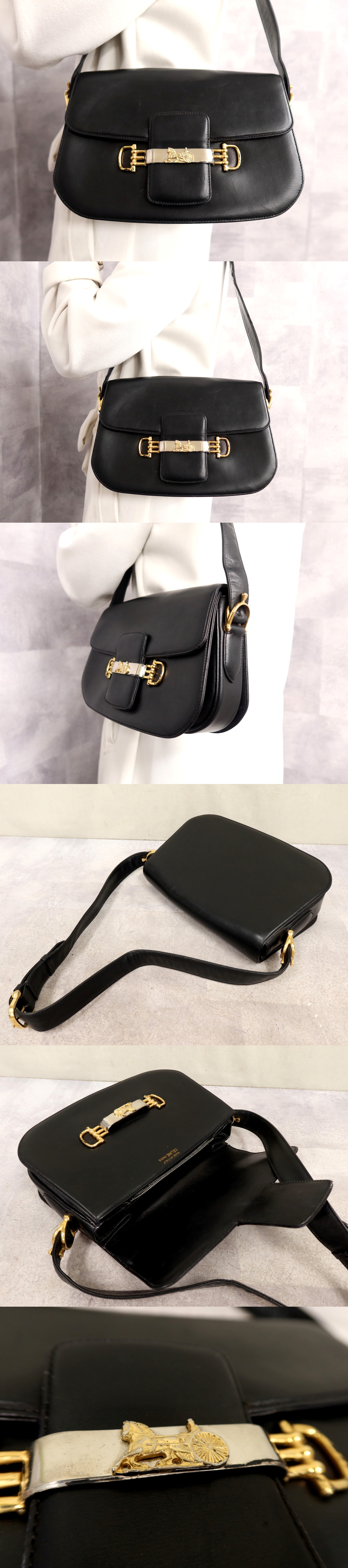 ●超美品●CELINE セリーヌ●馬車金具●カーフ レザー 本革●ショルダー バッグ●黒●ゴールド シルバー金具●ヴィンテージ●収納●Js64187 收藏