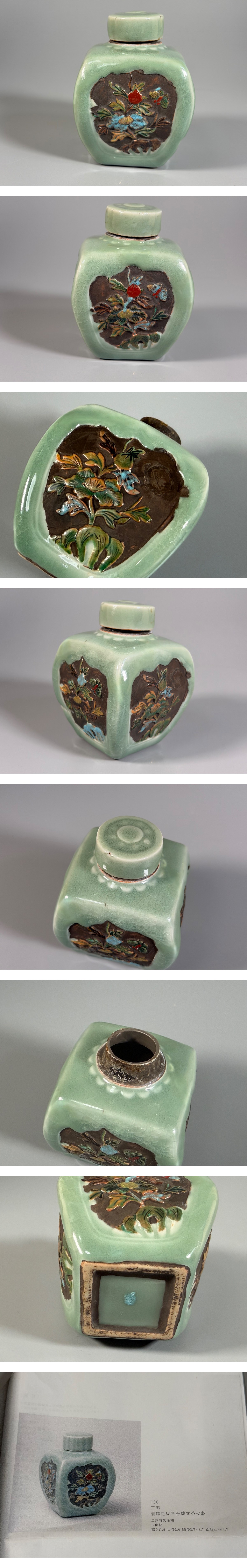 【小】5517 江戸期 希少 古三田青磁色絵牡丹蝶文茶心壺 美術館図録本所載現物品 茶壺 茶道具 煎茶道具 茶器 小壺 古玩 收藏
