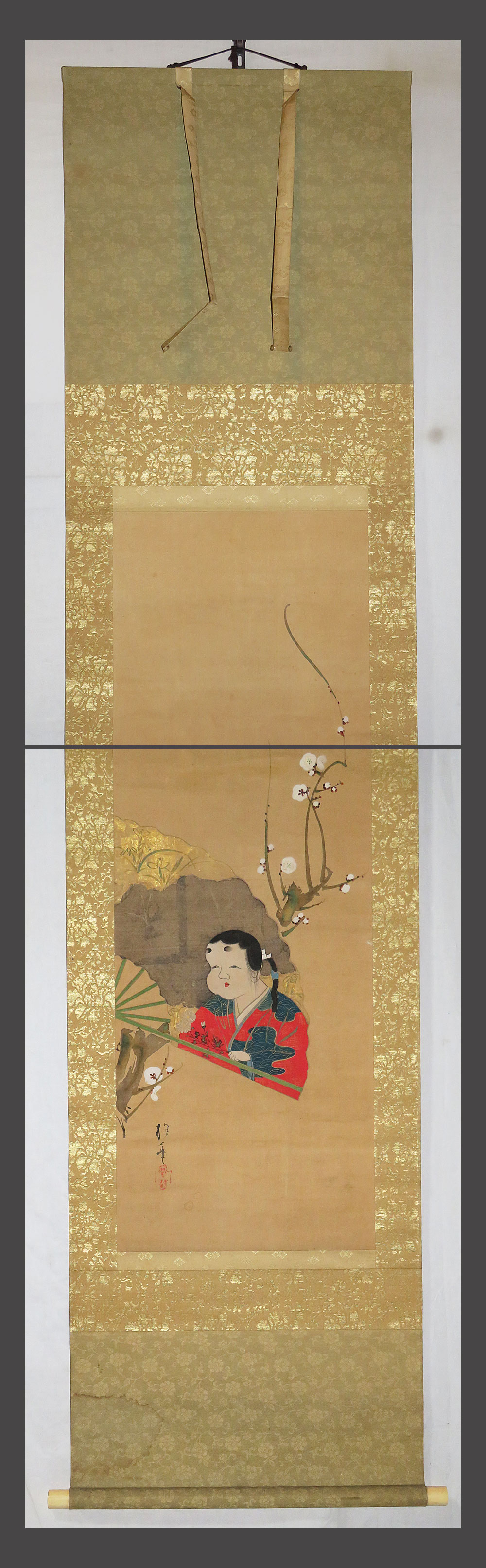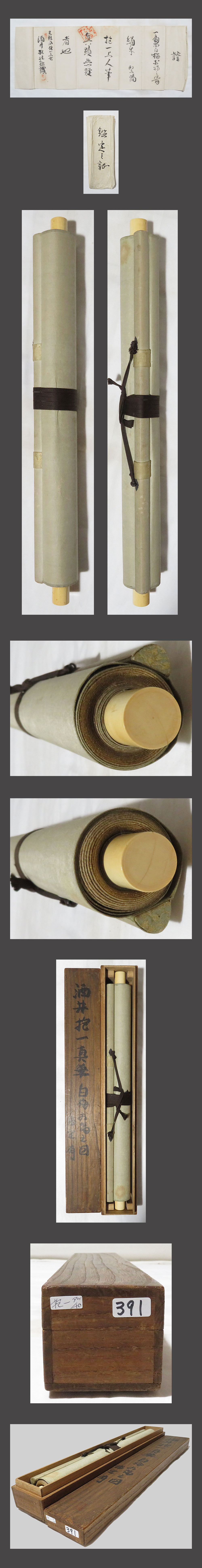 肉筆、真作保証。 作品に、時代感、多数のシミ、汚れ、多数の折れ、 巻きじわ、多数の浮いてる箇所があります。 表装に、時代感、多数のシミ、汚れ、折れ、巻きじわがあります。 表装下部に、経年による多数のシミ、汚れがあります。 表装裏側に、経年によるシミ、汚れがあります。 箱は合わせ箱です。軸先があります。酒井抱祝の鑑定証が付いてます。 酒井抱一 略歴:美術評価額3500万(書画)別号屠龍、雨華庵鶯邨、 紫石門、光琳慕、書俳巧、没年文化11年、享年68歳。 酒井抱祝 略歴:江戸琳派最後の画家で、明治11(1878)年に 雨華庵4代目酒井道一の息子として出生。絵を父に学ぶ。 大正2(1913)年に雨華庵5代目を継いだ。 号は唯一、抱祝、狗禅とも。昭和31(1956)年没。 下記の真作保証について・注意事項をよくご覧の上、 お気に召された方に、お譲り致しますので、ご入札を宜しくお願い致します。 |