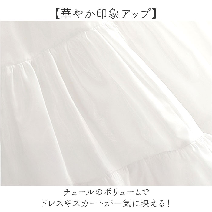 | 商品説明 | ・・【軽やかボリューム】 ・ふんわり広がるチュールで美しいシルエットを演出♪ ・【着脱らくらく仕様】 ・ウエストゴムで脱ぎ着しやすく快適な履き心地を実現◎ ・【透け感を防いで安心】 ・二重構造で気になる透けを防いで上品に着こなせる。 ・【華やか印象アップ】 ・チュールのボリュームでドレスやスカートが一気に映える! ・【発表会に最適】 ・ダンスや舞台衣装を格上げする頼れるインナーアイテム〇 |