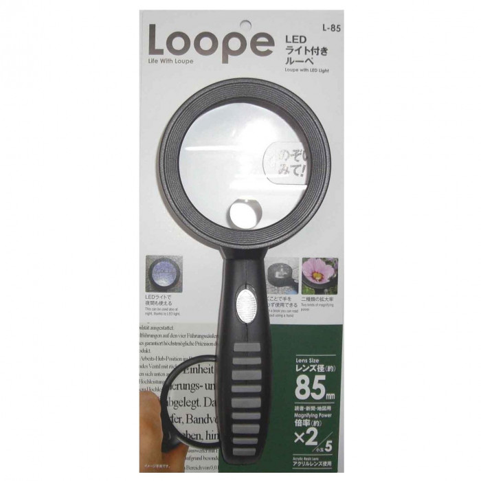 | 大口径85mmの、手持ち取っ手が付いた置き型デスクルーペです。明るいLEDライト付です。アクリルレンズを使用しています。 |
