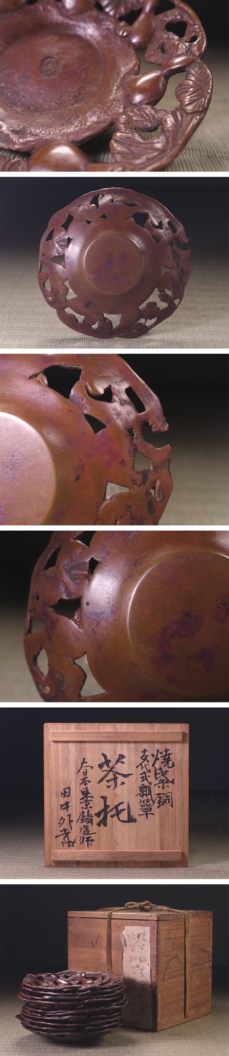 ∇花∇大日本東京鋳造師【田中外光】作 焼紫銅古代式六瓢茶托十客 重厚厳かな煎茶道具 收藏