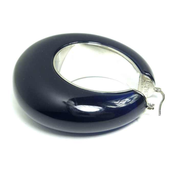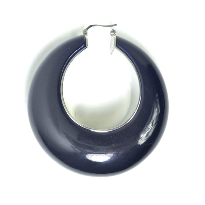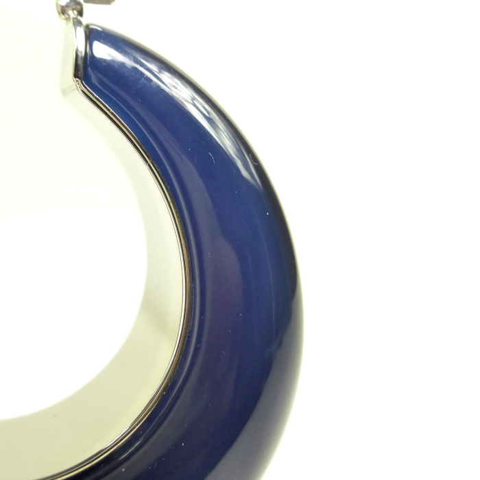 | ロエベのフープピアス。 深みのあるダークネイビーカラーのボリュームと存在感あるデザイン。 穏やかな曲線は顔まわりを美しく引き立て、エレガントな華やかさをプラスしてくれるジュエリーです。 シンプルなデザインで様々なコーディネートで活躍すること間違いなし。 |