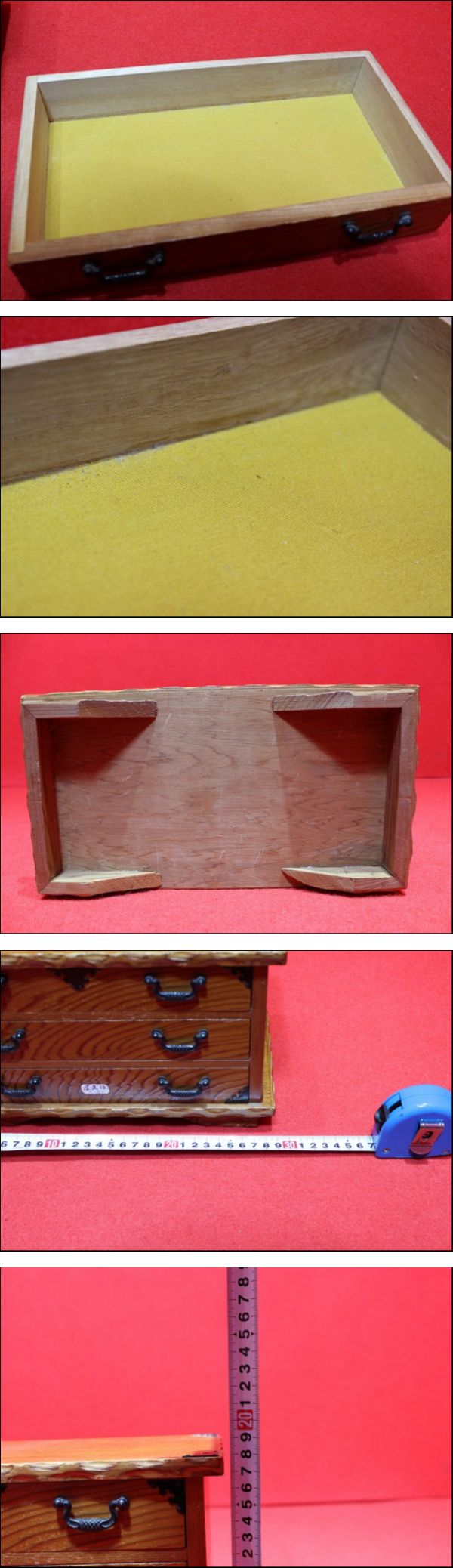 | ■□■□■ ご覧頂き誠にありがとうございます ■□■□■ 【希少】屋久杉 さつま印 3段小箪笥 小物入れ です。 本体サイズ:幅 約29cm、奥行 約15cm、高さ約18cm。 中古品となります。 使用による小傷、擦れ、削れ等ございます。 状態は写真にてご確認ください。 [重量] 約1.5kg [サイズ] 高さ 約18㎝ 幅 約29㎝ 奥行 約15㎝ [梱包時サイズ] 80サイズ(佐川急便) ※最少の梱包を心掛けておりますが、商品の安全の重要性により、 サイズが変わる事が御座います。予めご了承ください。 ※中古品であること、現状販売であることをご理解いただける方のみ 御入札をお願い致します。 ※個人保管・経年による汚れ、傷等が見られます。 ※当方専門知識がない為、質問にはお答えできない場合が御座います。 ※知識不足によるカテゴリ違いがある場合が御座います。予めご了承くださいませ。 【商品状態の目安】 B S…新品または未使用品 A…中古品 未使用品に近い物(非常に状態の良い物) B…中古品 目立った傷や汚れ無し C…中古品 やや傷や汚れが有り D…中古品 傷や汚れなどが有り使用感の有る物 E…中古品 全体的に状態が悪い物 F…中古品 ジャンク品(状態は写真にてご確認をお願いします) ※最少の梱包を心掛けておりますが、商品の安全の重要性により、サイズが変わる事が御座います。予めご了承ください。 ※画像は現物を撮影しておりますが、照度、遮光、モニターによっては実物と色目が異なって見えることがありますのでご注意ください。 ※写真に写っているものが商品全てとなります、御注意下さい。 【評価について】 基本的に当方から評価は致しません。 ※評価ご希望の方は、「受け取り連絡」を頂いた後、取引ナビにてご連絡ください。 | ||