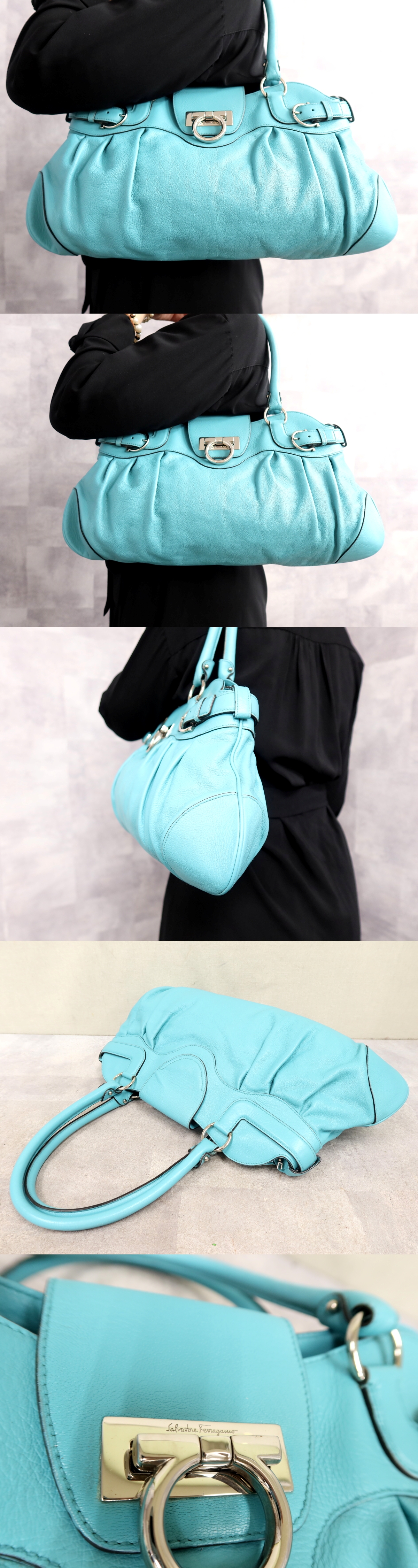 超美品●Salvatore Ferragamo フェラガモ●ガンチーニ●マリッサ●カーフ レザー 本革●ショルダー バッグ●ターコイズブルー●B5●Js66577 收藏