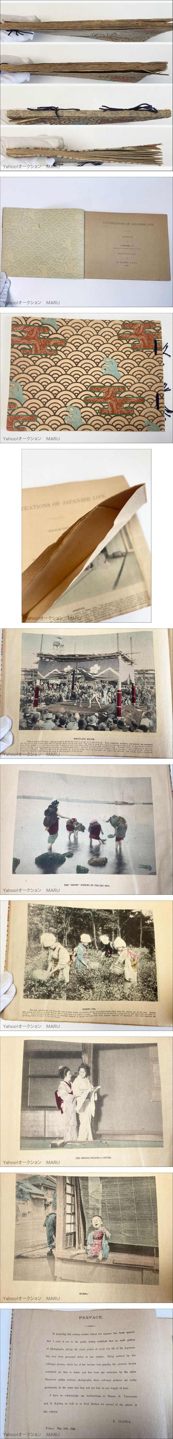 | 書名:Illustrations of Japanese Life(日本の生活の図解) 著者:S. Takashima(高島捨太) 発行・翻訳:K. Ogawa(小川一真) 発行年:明治29年(1896年)6月 東京発行 製本:ちりめん本(縮緬本)/和綴じ/間紙入り サイズ(約):24.7cm x 18cm x 1cm ページ数:14ページ 写真数:手彩色コロタイプ写真 12枚 明治期の日本の生活・風俗を捉えたコロタイプ印刷・手彩色の写真図版集です。 ![]() ■ 状態 ■ キーワード:小川一真 ちりめん本 縮緬本 明治 1896年 手彩色 コロタイプ 写真 日本 風俗 和本 古書 Japonica 外国向け 稀覯本 コレクター 明治工芸 Meiji crepe paper book [English Summary] "Illustrations of Japanese Life" — A rare Meiji-era (1896) crepe paper book (chirimen-bon) published by K. Ogawa (Ogawa Kazumasa) in Tokyo. Contains 12 hand-colored collotype photographs depicting Japanese customs: greeting ceremonies, flower viewing, sumo, geisha, rickshaw, and more. With interleaving tissue pages. Binding intact with indigo thread in Japanese style. Minor foxing on some pages. An exceptional piece for collectors of Meiji Japan photography, Japonisme, or crepe paper books. 詳細は画像をご覧ください。ご不明な点はお気軽にお問い合わせください。 出品中の古書はここ←をクリック |