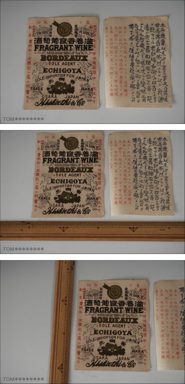 [aa830]【希少】時代 ワイン広告 引き札 2種セット「滋養香鼠葡萄酒」ボルドー輸入 越後屋 大阪 菱H(賣捌元)骨董 レトロ 紙モノ 当時物 收藏