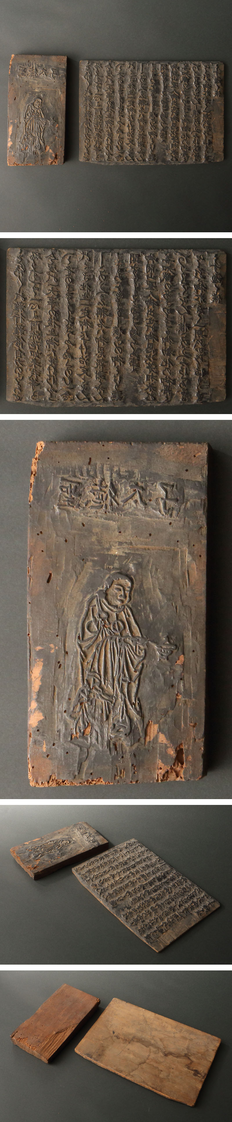 江戸期の古版木です。 真宗寺院で教化活動のために用いられた、領解文(改悔文)と聖徳太子の絵像です。 自宅や遠方でも教えに触れるための工夫が感ぜられる、真宗教団を支えた礎ともいえる逸品です。 ◆領解文 本願寺八世・蓮如上人が真宗における信仰の在り方を示すために作成した文。浄土真宗本願寺派では「領解文」と呼び、真宗大谷派では「改悔文」と呼ぶ。安心・報謝・師徳・法度の四つの事柄について示され、門徒が各自で読み上げ、自身の信心に誤りが無いことを確認するために制定された。 〔本文〕 もろもろの雑行雑修自力のこころをふりすてて、一心に阿弥陀如来、われらが今度の一大事の後生、御たすけ候へとたのみまうして候ふ。たのむ一念のとき、往生一定御たすけ治定と存じ、このうへの称名は、御恩報謝と存じよろこびまうし候ふ。この御ことわり聴聞申しわけ候ふこと、御開山聖人御出世の御恩、次第相承の善知識のあさからざる御勧化の御恩と、ありがたく存じ候ふ。このうへは定めおかせらるる御掟、一期をかぎりまもりまうすべく候ふ。 寸法:(領解文)縦16.5cm、横23.5cm、奥行1cm、(聖徳太子孝養像)縦17cm、横9cm、奥行2.5cm(最大幅。若干の誤差はご了承下さい) 状態:経年によるイタミ、虫喰い・ワレ・カケ多数がございます。 |