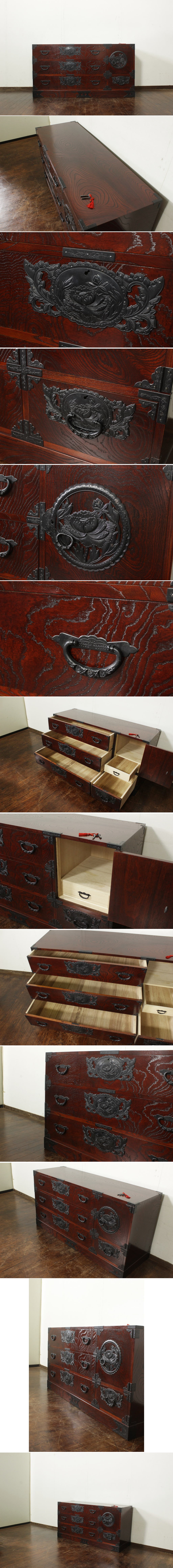 未使用保管品 欅産業製 4.5尺 牡丹金具 仙台箪笥 欅杢・中桐 衣装箪笥 時代箪笥 和家具 民芸家具 古家具 アンティーク 和モダン 伝統工芸 收藏