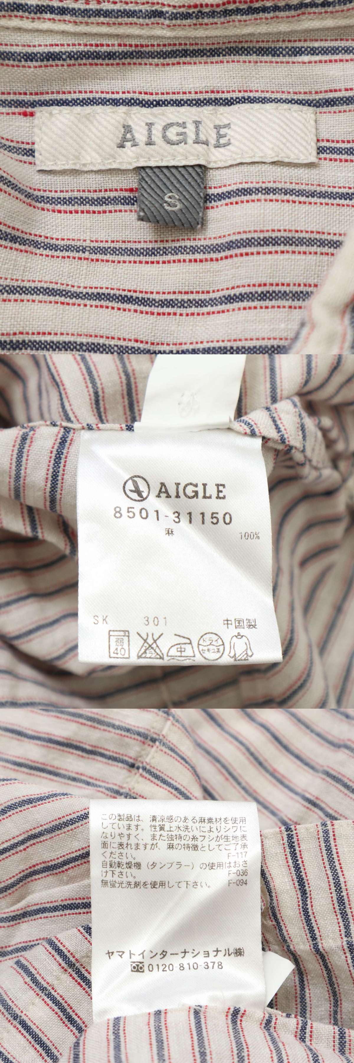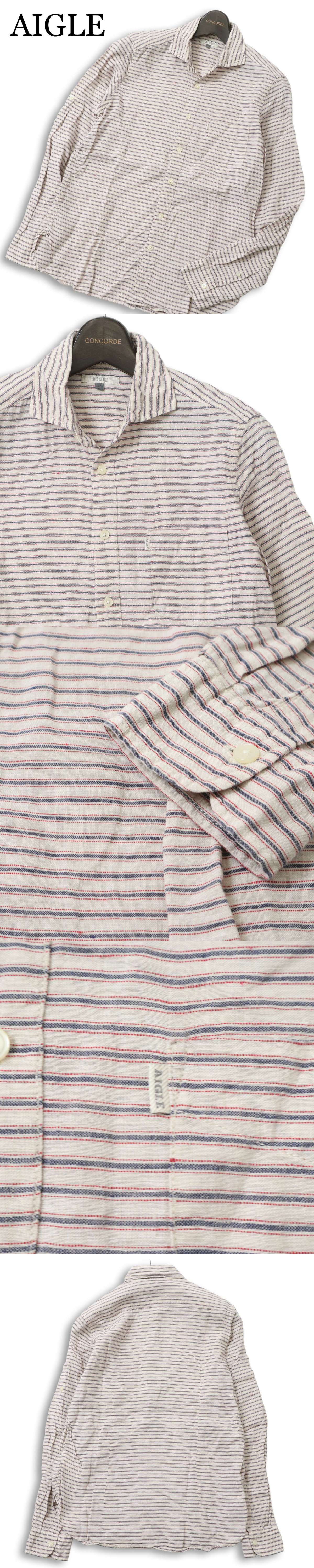 AIGLE エーグル 春夏★ 麻 リネン100% 長袖 ボーダー ネップ スリム ボタンダウン シャツ Sz.S メンズ アウトドア 收藏