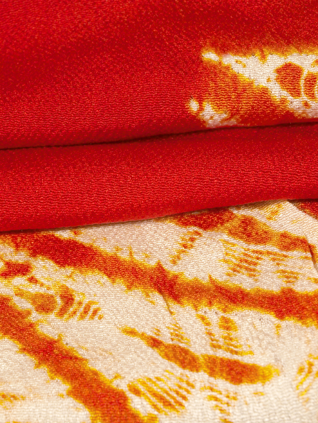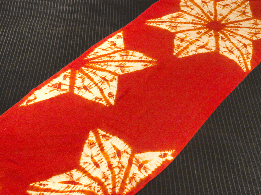 やや沈んだ猩猩緋(しょうじょうひ)色の地に、縫い絞り染めで麻葉(あさのは)の文様が施されている、縮緬のはぎれです。 明治期ごろにつくられたと思われるアンティークのお品です。大きめのシボの縮緬地です。 全体の端付近に縫い跡があり、その縫い跡にヒケている部分がところどころにあるほか、絞りの縫い跡にもヒケている部分がところどころにあります。そのほかに目につく大きなしみやよごれ、褪色などのダメージはなく、この時代のものとしてはきれいな状態です。生地の力はあります。風楽の出品内で同じ柄の寸法違いのものを複数出点している場合もあります。 |