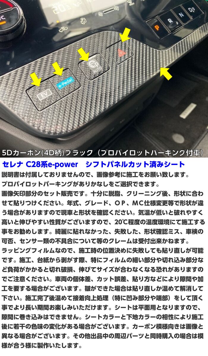 セレナC28系e-powerシフトパネルカット済みシート プロパイロットパーキングありとなしがございますので、落札後カラーと一緒にご連絡をお願い致します。 ガソリン車用は別ページで販売中です。 MC仕様変更やOP、グレード等で形状が異なる場合がありますので現車をご確認ください。 ★材質:PVC ★厚さ 約0.12mm~0.18mm(シート種類による) ★耐熱90度 ★屋外約2-3年(メーカー値、使用環境、シートの種類による)
