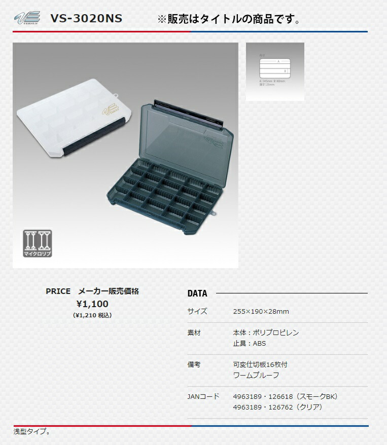 メイホー MEIHOツールケース VS-3020NS※販売はタイトルの商品です。浅型タイプ。■DATA・サイズ 255x190x28mm・素材 本体:ポリプロピレン 止具:ABS・備考 可変仕切板16枚付 ワームプルーフ