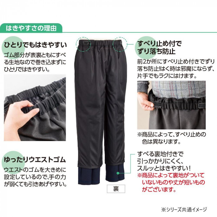 | 後ろに手が回らない、おしりに引っ掛かってズボンが上げられない問題を解決できるズボンです。ウエストゴム部分がすべりやすい素材でまたすべる裏地がついているので引っ掛かりにくくスルッとはけます。また前2か所にはすべり止めがついており、ずり落ちる心配もありません。片麻痺や拘縮のある方にもおすすめです。 |