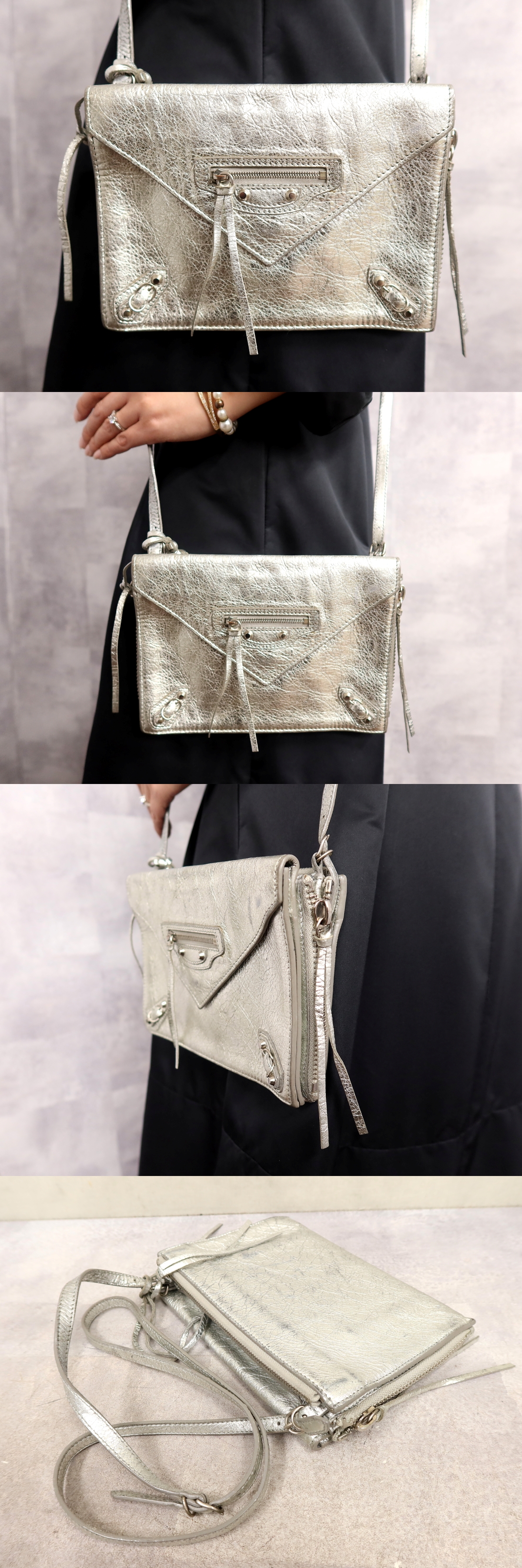 ●美品●バレンシアガ●ペーパートリプル XS●カーフ レザー 本革●ショルダー バッグ●シルバー メタリック系●SV金具●斜め掛け●Js63867 收藏