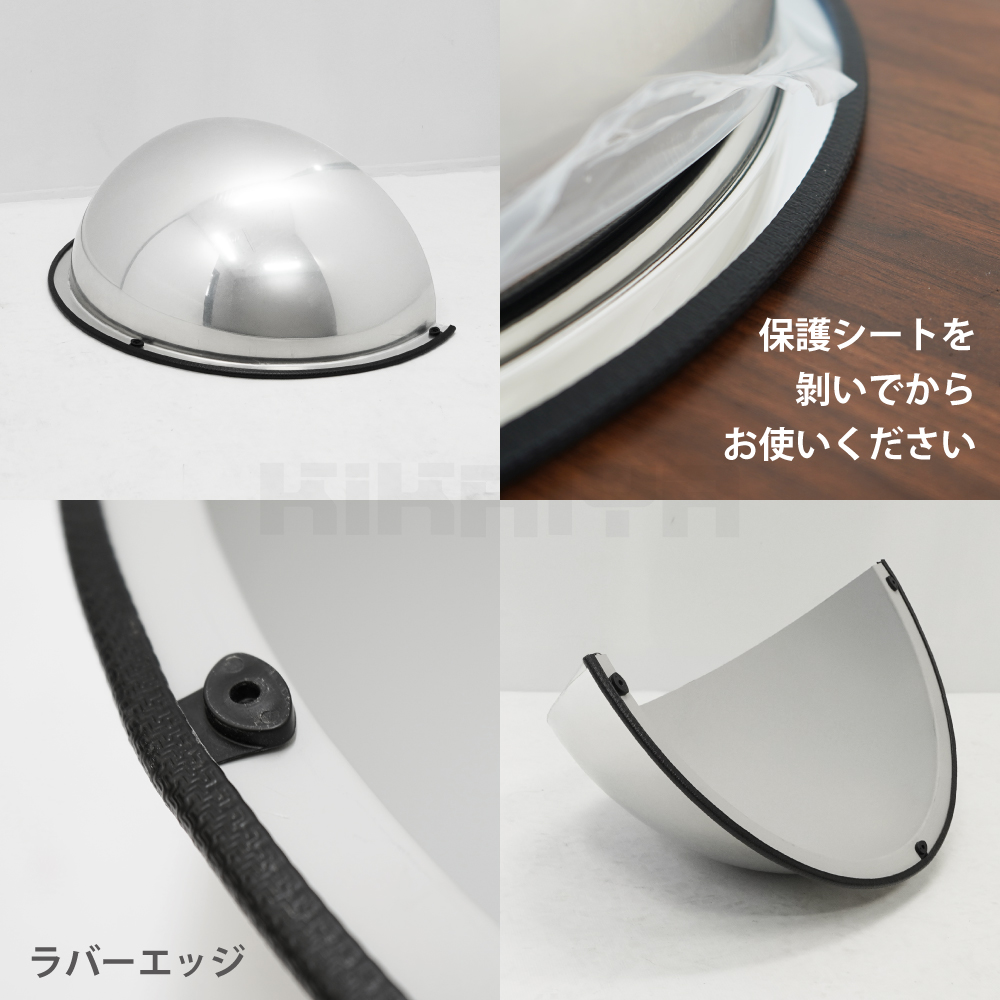 ●180°の広い視野角を持つ、1/4球面のミラーです ●事務所、店舗、倉庫など様々な場面で活躍できます ●T字路などでの衝突防止に効果的で、人や台車などの接近が目視できます ●鏡面は軽量で耐衝撃性に優れているアクリル製で、 万が一割れても飛散しにくい ●天井や壁などの平面に取付けできるネジ付き ●取付けはお客様でお願いします |