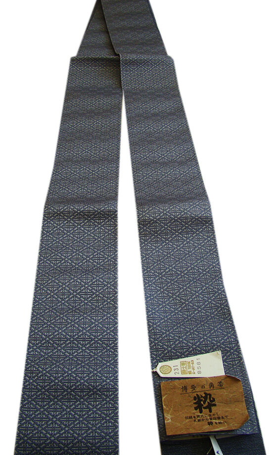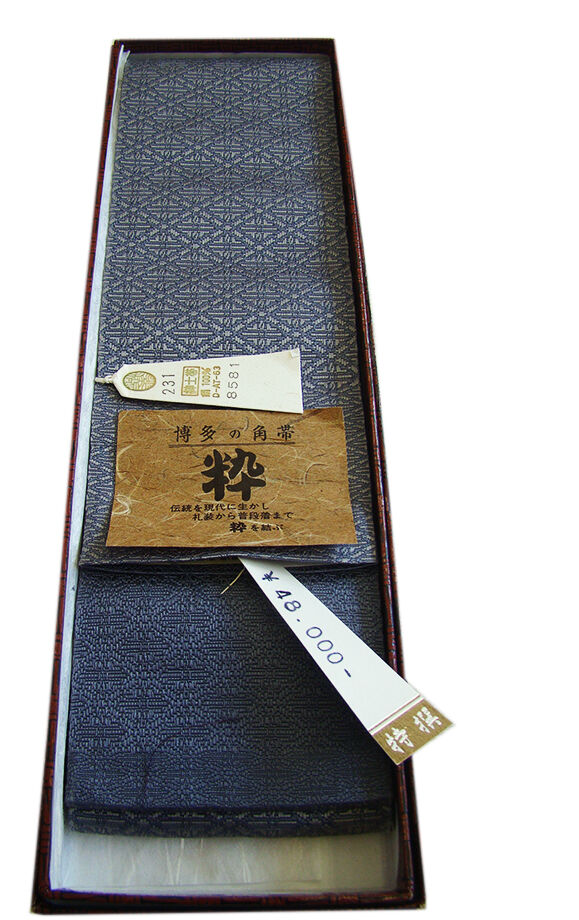 ●未使用。 ●正絹 一度〆たら緩まないと昔から言われるしっかりとした扱い易く 結び易い本場筑前博多織の角帯。 藍鼠色地にグレー色の織柄。 裏面は藍鼠色地に地模様入りの織柄。 端は切りっぱなしになっております。 市場販売価格¥48,000 ※締めた時にキュッとなる絹づれの音や帯の締まり具合が心地良い、 人気の本場筑前博多織の珍色の粋な角帯です。 浴衣はもちろん、紬や大島からお召し、黒紋付の正装までご使用頂けます。 弓道や剣道・居合道などの袴下帯としてもお薦めです。 |