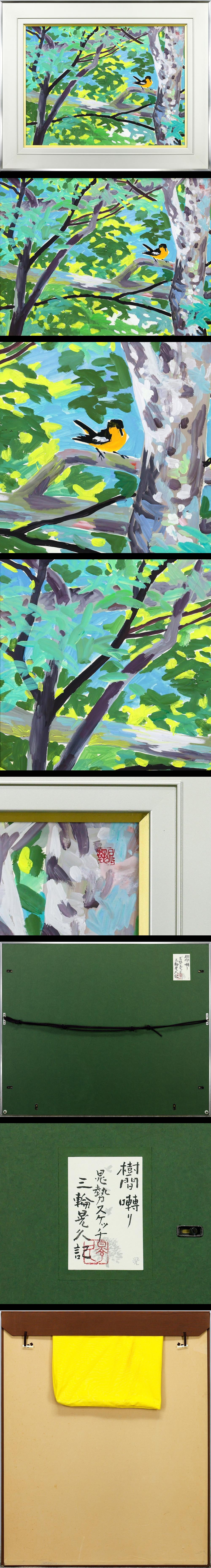 【真作】【WISH】三輪晁勢「樹間囀り」日本画 12号大 大作 三輪晃久鑑定シール ◆若葉に憩う小鳥 〇日本芸術院会員 日展顧問 #26022754 收藏