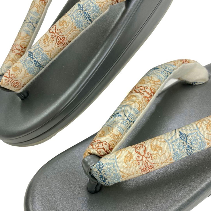 | フォーマルからカジュアルまで幅広く使われ、特に訪問着や付け下げなどの装いに合わせる草履に多く見られます。 シルク製の花柄鼻緒を持つ草履、エレガントなデザイン。 - 鼻緒のデザイン: 龍村伝統復古柄 - 底材: 合成樹脂 - 高さ: 約6cm ご覧いただきありがとうございます。 |