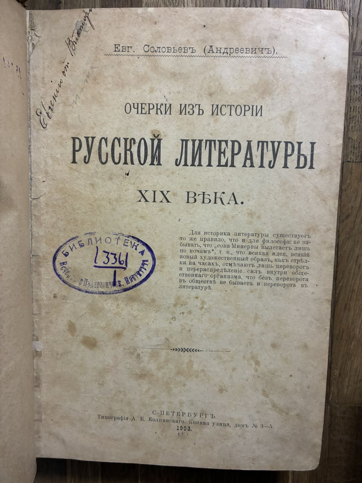 1903年 エフゲニー・ソロヴィヨフ ロシア文学史論集 19世紀 Очерки из истории русской литературы 收藏
