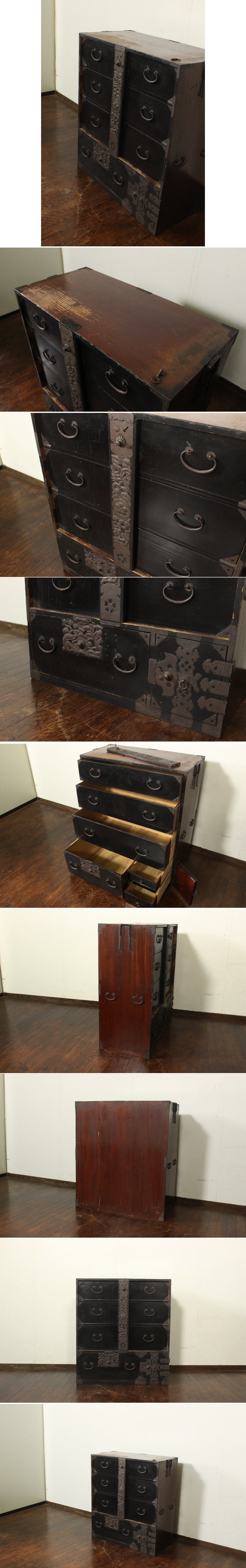 明治期 庄内衣裳箪笥 閂付き 鍵付 打ち出し金具 無垢材 時代箪笥 和箪笥 古家具 古民家 店舗什器 居酒屋 收藏