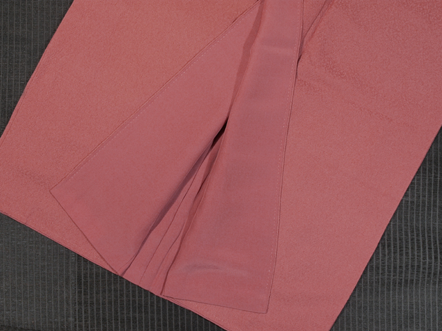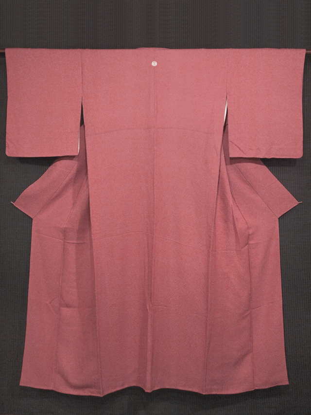 沈んだやや淡い銀朱色の地に霜降りの地紋が織り出された、紋意匠縮緬の色無地です。袷仕立てです。染め抜きで「丸に五三桐」の一つ紋が付いてています。 桃の赤みを帯びた部分のような、可憐でかわいらしいお色目です。沈んでいるので派手さはなく、品の良い雰囲気です。重めの上質な縮緬地です。 ユーズド品と思われますが、使用感はあまり感じられません。しみやよごれなどのダメージも見あたらず、とてもきれいな状態です。 |