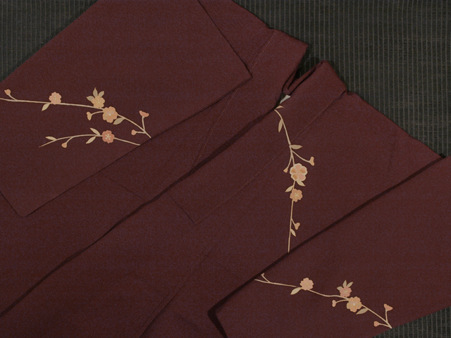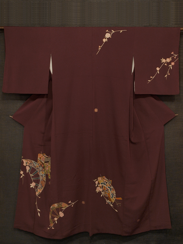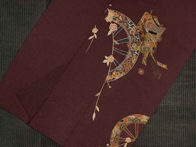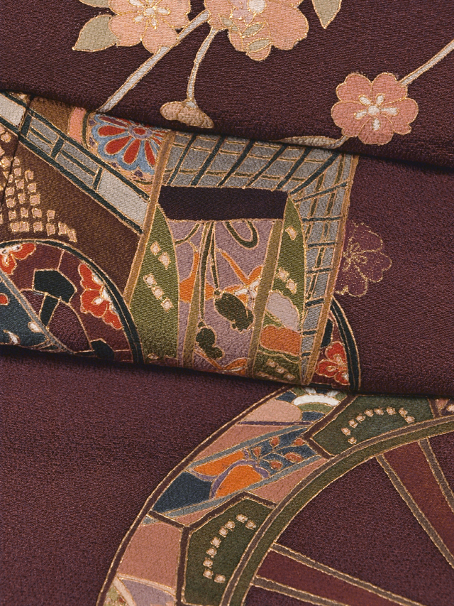 葡萄茶(えびちゃ)色の地に、枝桜と片輪車、御所車の文様が友禅染めされた縮緬の付下げ訪問着です。袷仕立てです 源氏車と御所車にも桐や小紋が配されています。文様の輪郭の糸目には金彩が施されています。やわらかでややシャリ感のある縮緬地です。 ユーズド品で、両衿山にうっすらとくすみがありますが、使用感はそれほど感じられません。衿山のくすみはお手入れに出していただければ、きれいになりそうで、そのほかに目につくしみやよごれ、褪色などのダメージはなく、きれいな状態です。 |