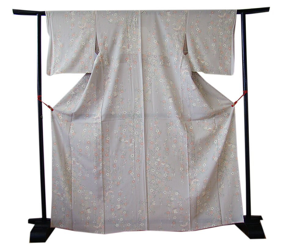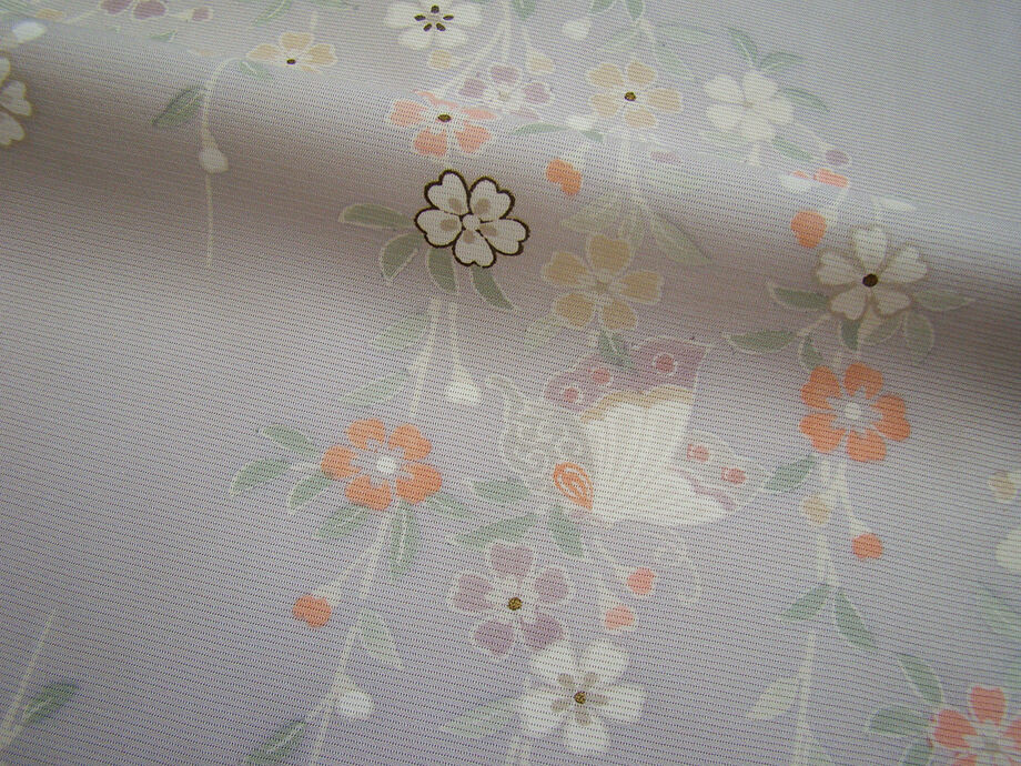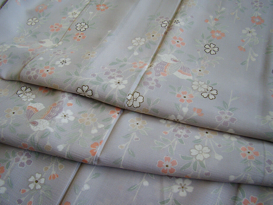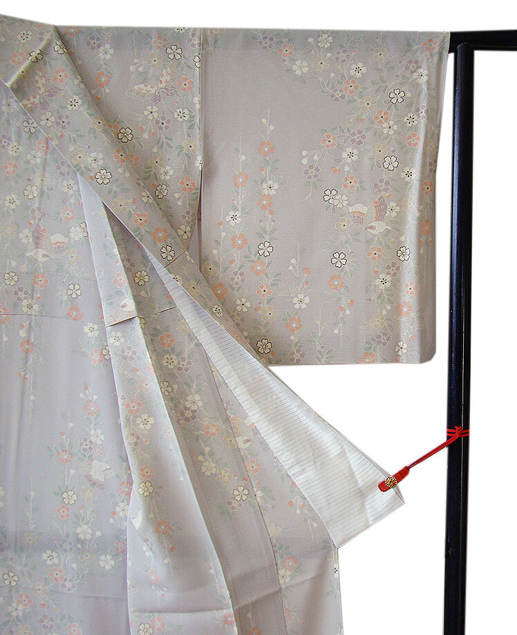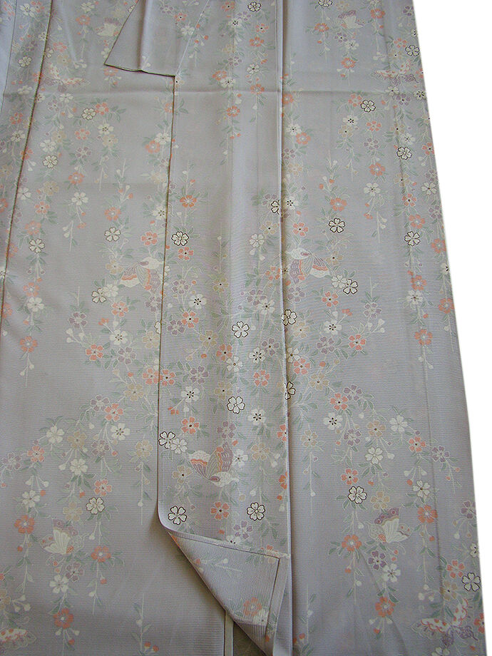 薄梅鼠色地に白、紅梅、藤鼠色等の花草、蝶柄の染柄に金彩加工が