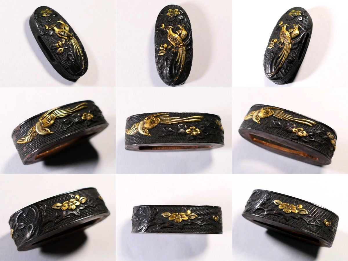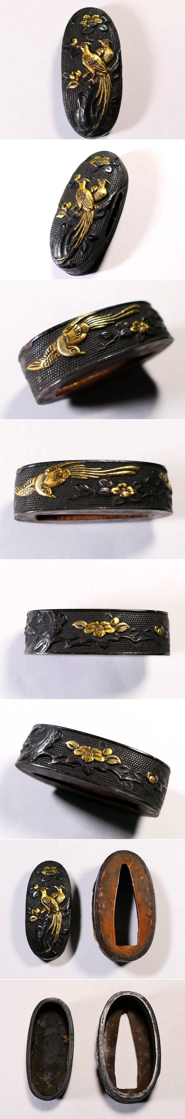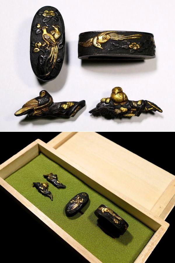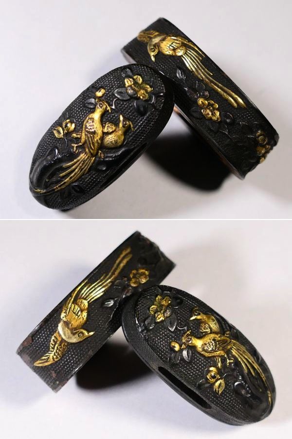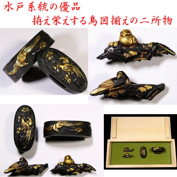 【刀装具 #3906】 ≪A級≫ (二所) 水戸系統の優品 拵え栄えする鳥図揃いのセット 縁頭:尾長鳥図 目貫:梟に猛禽類の図 收藏