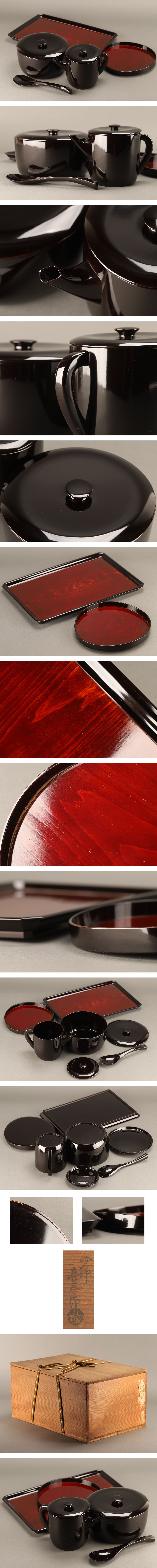 丸盆 幅 約25.2×23.6cm 高 約3.2cm 長方盆 幅 約44.2×29cm 高 約2.5cm 湯桶 幅 約23×14cm 高 約15.5cm 飯櫃 幅 約21.3×21.3cm 高 約13.5cm 杓文字 約6.7×24.5cm |