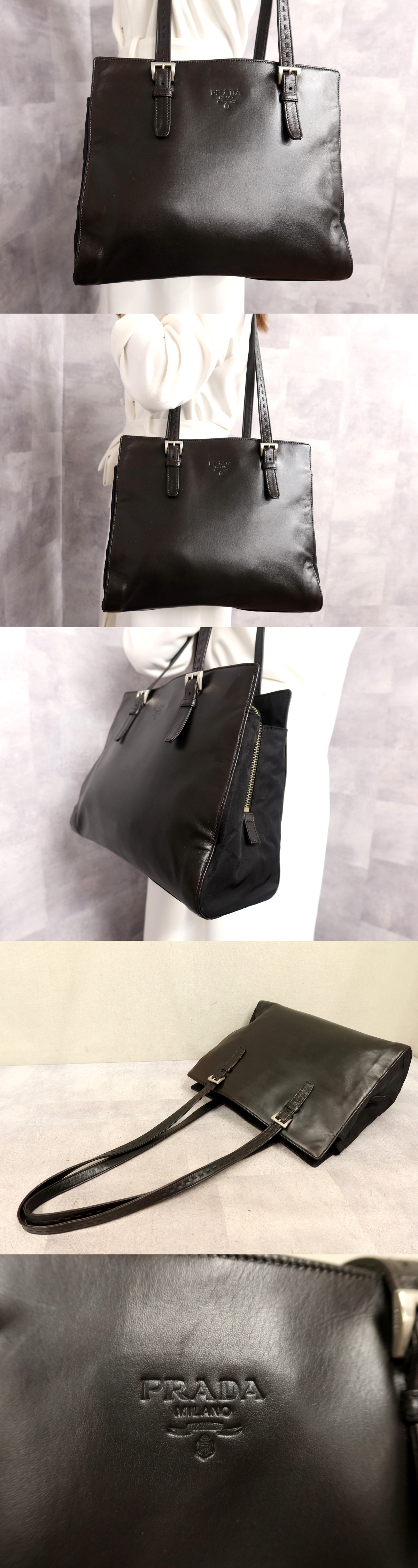 ●超美品●PRADA プラダ●ポコノ ナイロン ラム レザー 本革●ショルダー バッグ●ダークブラウン 黒●シルバー金具●肩掛け●B5●Js62147 收藏