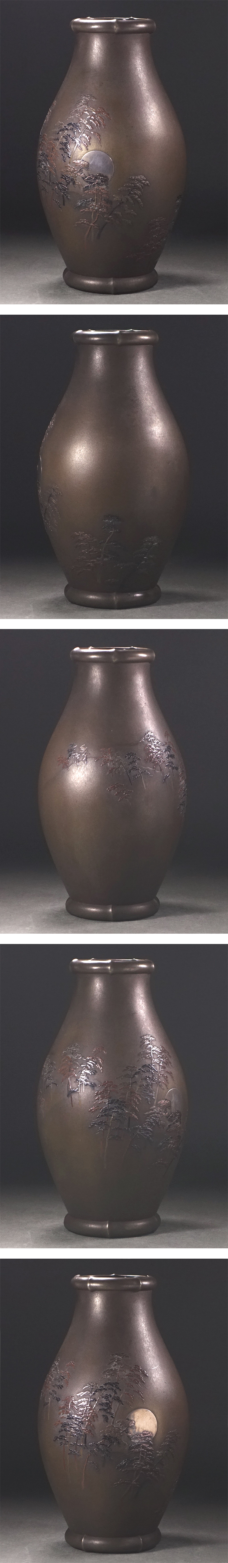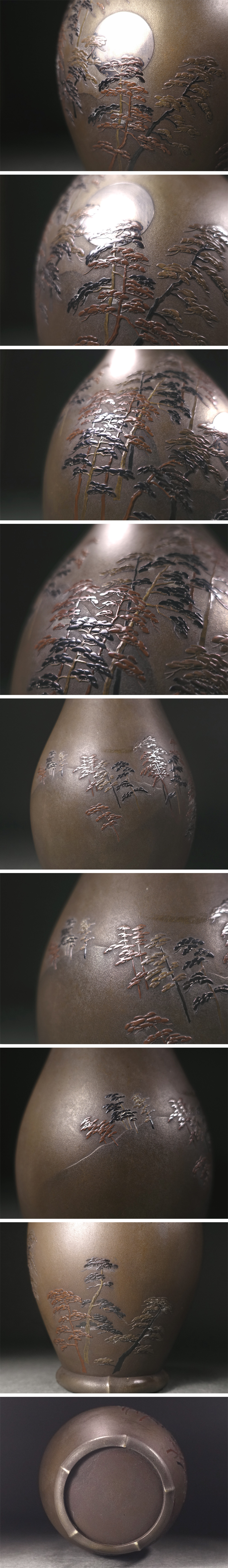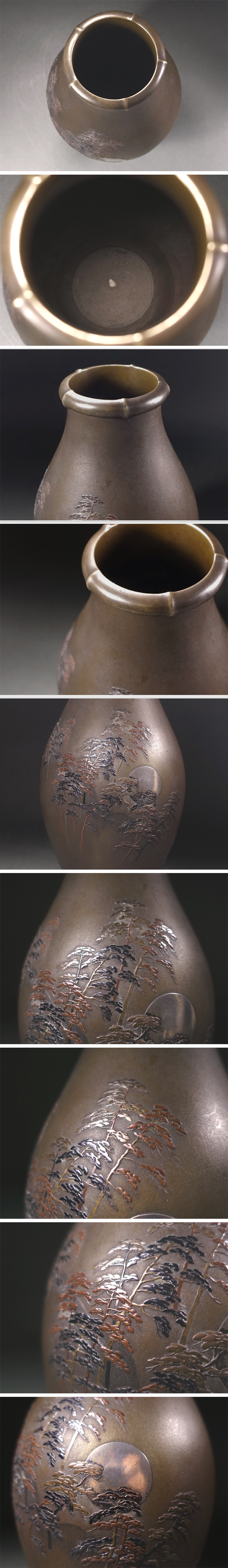 ∇花∇明治時代【京都能川商会(能川登)】謹製 銀象嵌月下松林図銅花瓶 明治金工の卓抜した秀作 收藏
