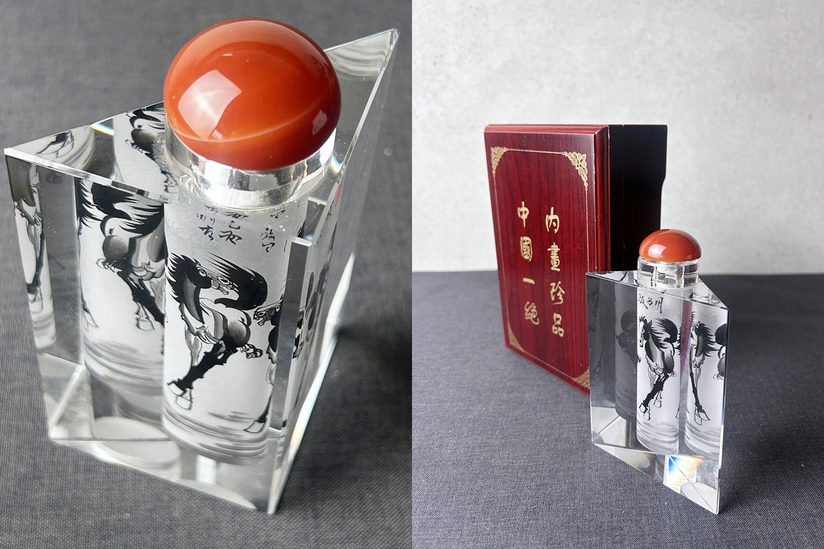中国一絶 内書珍品 三角 ガラス瓶 木箱入り◇鼻煙壷/ガラス細工/香水瓶/内絵/中国美術工芸/馬紋/蓋付瓶/小瓶/飾り物/置物/骨董/唐物 收藏