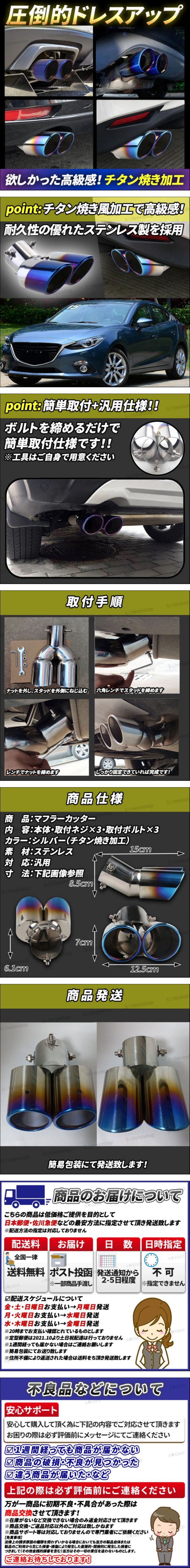 | デュアルマフラーカッター 2本出しになります! ステンレス製でサビに強い!高品質・汎用設計のマフラーカッターです! チタン焼き加工で高級感がありドレスアップに最適です 汎用設計のため、軽自動車から普通車にもご利用できます! 取付も3点ボルトの締付で簡単にできます! ※安全のためしっかりと固定を行ってください | ||