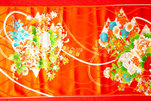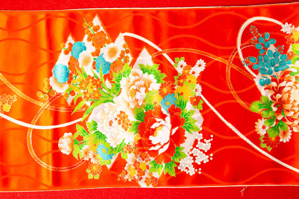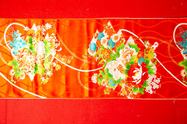 正絹の四つ身友禅反物の切り売りです。 古布ではありませんが、十数年前に染めた 商品です。 巾36cm、長さ100cmのお値段です。 光の具合で薄く映っているところがありますが ?同じ色です。 赤毛氈の上で撮影しております 切らずに7mまで可能です