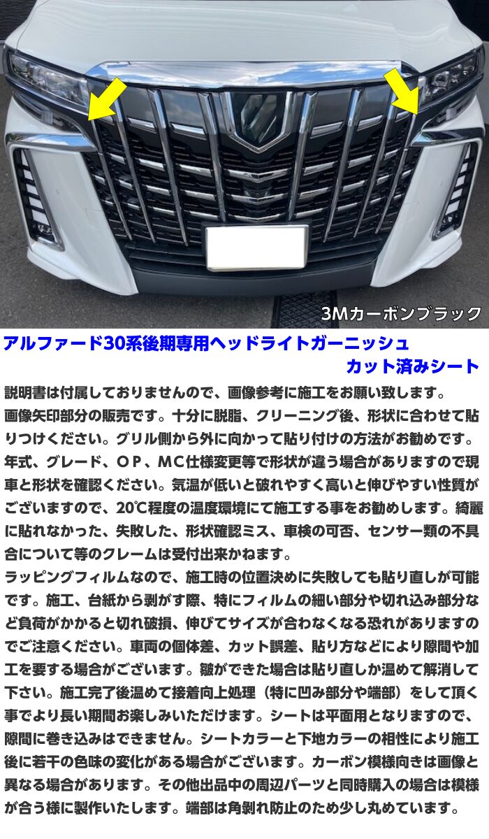 ※カーボンホワイト、ギャラクシーブラックは廃盤の為お選び頂く事ができなくなりました。 3M製以外は別ページで販売中です。 ※ご連絡なくお支払が終わっている場合はカーボンブラックにて発送させていただきます。 ③車両専用ラッピングシート ラッピングシートは剥がす際に糊残りがしにくく、貼り付けに失敗した場合でも 貼り直しが可能です。 当店では、雨、紫外線、風埃、熱等の環境が過酷な自動車には車両専用のシートをご使用される事を推奨しております。 ◆商品詳細◆ ★商品名:アルファード30系後期S系グレード