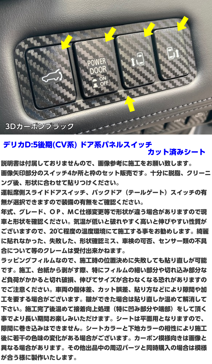 ②デリカD:5 CV系後期適合 カット済みなので、張り付けるだけの作業で見た目が変わります。 グレード、オプションの有無、年式、MC仕様変更等で形状が違う場合がございますので、現車形状確認の上ご注文をお願いします。 形状確認ミスによるクレームは受付できません。 カラー、種類、は落札後にご希望の商品をご連絡ください。